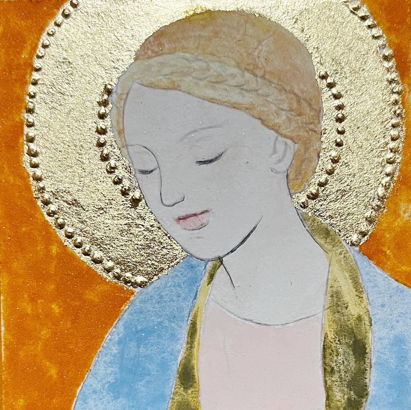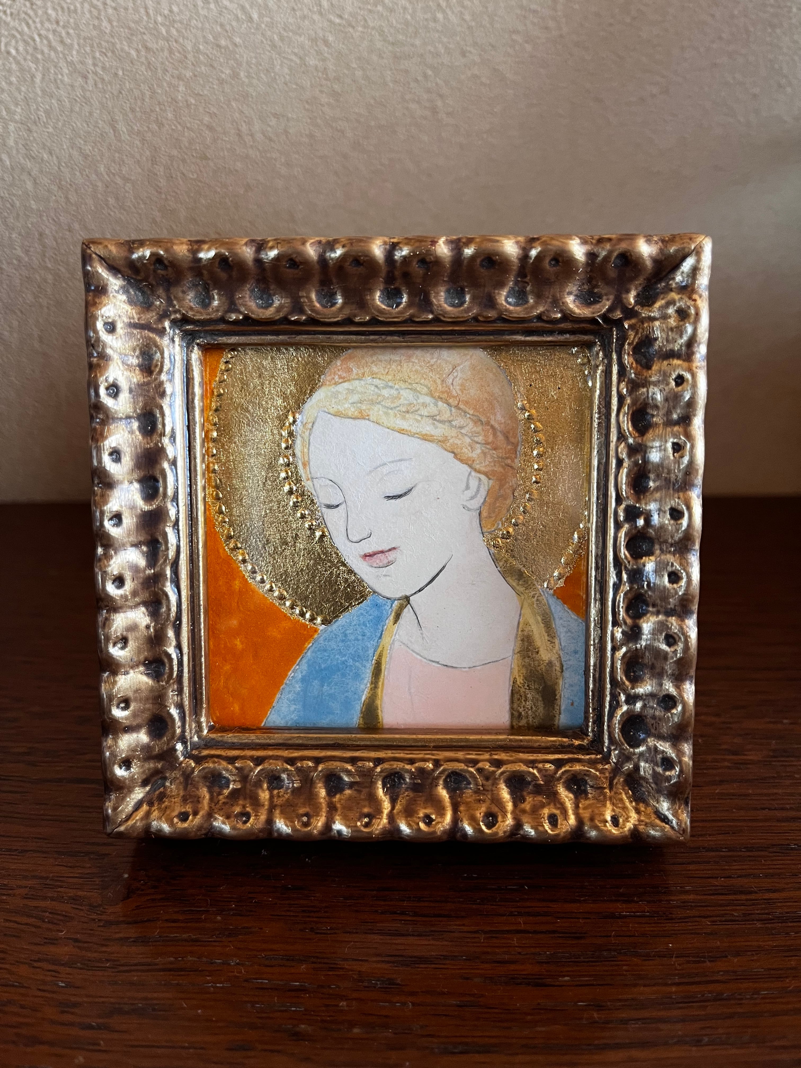 聖母様を初めて描かせていただきました。額縁の枠外に腕に抱くイエス・キリスト様を思い描き、聖母様が穏やかに微笑んでいる作品にしました。見ていただいた時、心が穏やかになるよう気持ちを込めました。